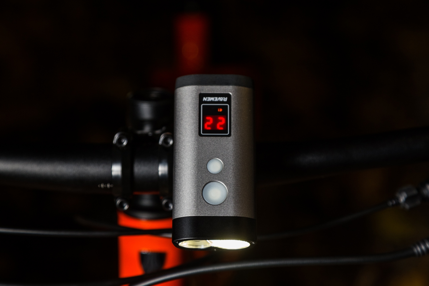 Самая технологичная велосипедная фара на сегодняшний день. Ravemen PR900 USB 900Lm это светодиодная фара для велосипеда с креплением на руль и выносной кнопкой. Источник света - 2 сверхъярких светодиода CREE XP-G2 со сроком службы 50000 часов. Аккумулятор встроенный Lithium-Ion (5200 mAh/3.7V), заряжается от USB. Фара может работать как power-bank и заряжать другие устройство. LED индикатор показывает, какой режим работы включен и сколько фара в нем проработает. Девять режимов работы фары постоянные, мигающие, турбо. Фара запоминает последний режим работы и его мощность. Максимальное время работы 20 часов. Корпус алюминиевый фрезерованный, влагозащищенный IPX8, погружение до 2 метров на 30 минут.