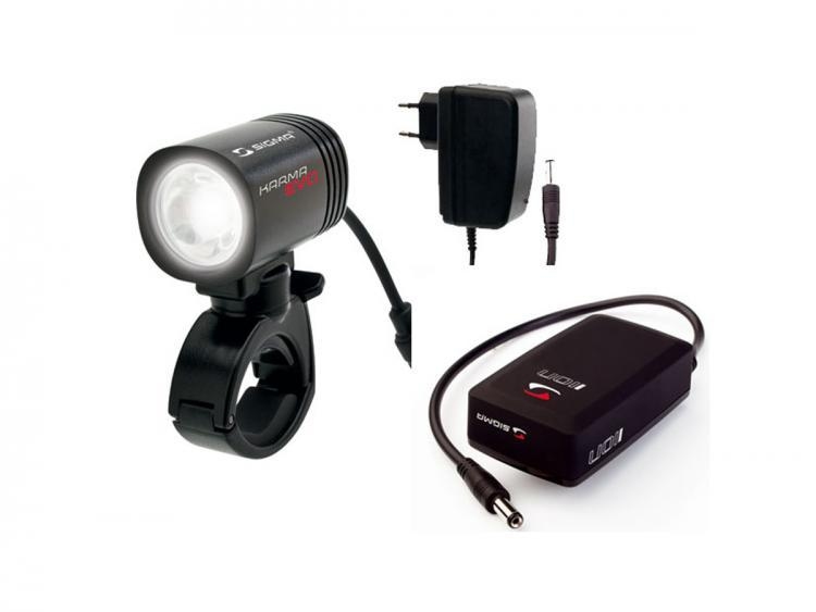 Фара светодиодная для велосипеда Sigma Karma EVO Pro + IION с креплением на руль. Источник света - один светодиод 320 люмен. Аккумулятор внешний IION, заряжается от сети за 3 часа до полного заряда. Четыре режима работы фары: мощный, стандартный, энергосберегающий, мигающий, стробоскоп, SOS. Время работы в максимальном режиме 2 часа. Корпус алюминиевый, влагозащищенный IPX7. Крепление универсальное, регулируется по горизонтали. В комплекте зарядное, крепление для аккумулятора.