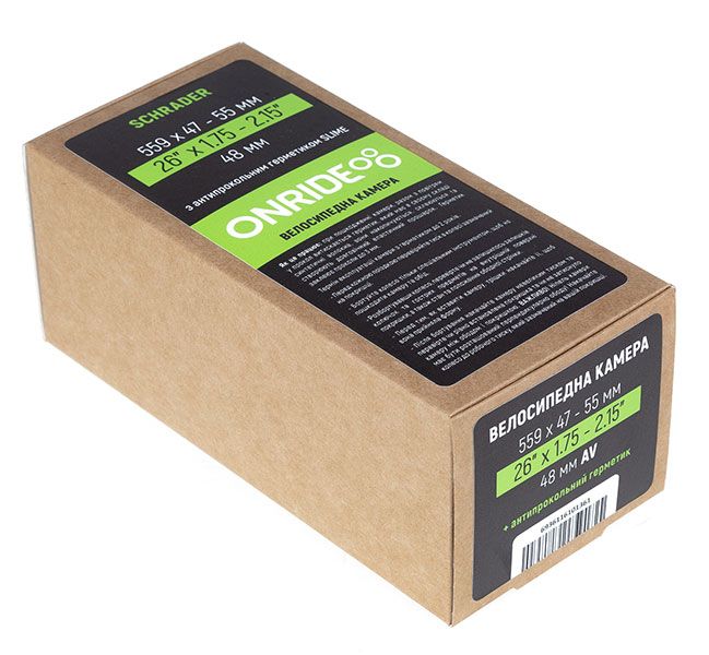 Камери ONRIDE з ніпелем Schrader (AV) мають конструкцію, яка забезпечує однакову товщину бутилкаучуку. Це означає, що вони не мають зайвої ваги і плавно котяться від поїздки до поїздки. Однакова товщина - знак якості. Важливо підтримувати в камері тиск (діапазон номінальних значень вказаний на вашій покришці). Неналежний тиск може бути причиною передчасної деформації камери (проколи / ""зміїний укус"" / руйнація матеріалу через утворення складок). Проти проколів діє, заповнений в камеру, герметик Slime.