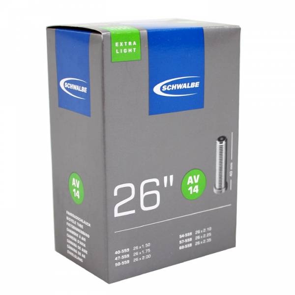 Камера для велосипеда Schwalbe AV14 XXlight для колес размером 26 дюймов. Подходит под покрышки с шириной 1.50-2.5. Тип нипеля автомобильный (шредер). Самая легкая камера в линейке - 95 грамм. На заводе Schwalbe время теста камеры под давлением 24 часа. Камеры для велосипедов изготавливают из бутилового каучука. Бутил это эластичная и воздухонепроницаемая синтетическая резина. Камеры Schwalbe прекрасно держат воздух. Высокая эластичность позволяет одной камере Schwalbe покрывать широкий диапазон размеров. На каждой коробке с камерой Швальба указаны: окружность покрышки, тип клапана, диапазон размеров покрышки.