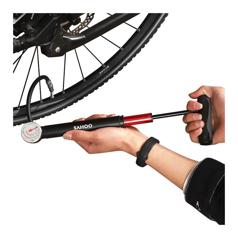 Насос для велосипеда Sahoo 311418 идет в алюминиевом корпусе и со шлангой. Корпус и шток насоса сделаны из алюминия, что продлит срок службы насоса. Компактный насос дает давление 120 PSI / 8 Bar. Головка насоса универсальная, не нужно ее настраивать на разные типы нипелля. На клапане есть защитный колпачек. С круглым манометром вам будет легко накачать покрышку до нужного давления. В комплекте - крепление на раму велосипеда, иголка для мяча.