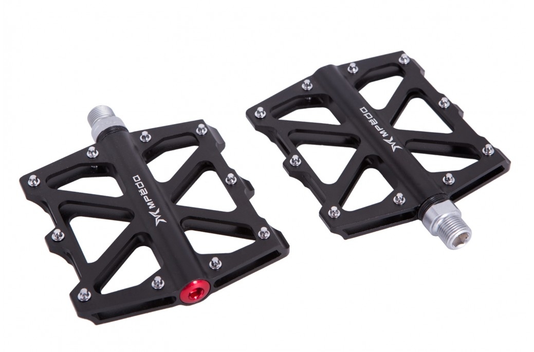 Алюминиевые педали для велосипеда Mpeda ALNC-634 на промподшипниках со сменными шипами подойдут для горных или BMX велосипедов. Материал оси хромоль, корпуса - фрезерованный алюминий. Сменные шипы добавят педали хваткости. Крышка, закрывающая подшипник, анадирована в красный цвет. Вес пары педалей 340 грамм.
