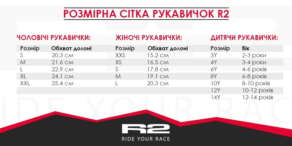 Детские велоперчатки R2 Loop, нужны чтобы рукам было комфортно. Рука в перчатке не скользит по грипсе, не набивается. Пошиты из эластичной ткани, она отводит влагу. На ладони гелевые вставки. Мягкая махровая ткань на большом пальце, чтобы вытирать пот. Можно быстро снять при помощи двух петель на пальцах. Стирайте вручную или в стиральной машинке при 30 град.