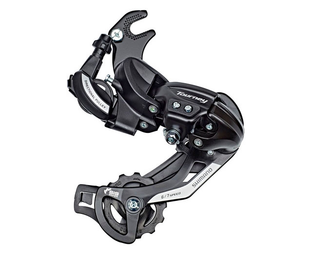 Задний переключатель Shimano RD-TY500 на 6/7 скоростей. Прочная рамка переключателя изготовлена из стали с пластиковыми накладками. Большие ролики переключателя облегчают переключение скоростей. Подходит для кассет со звездами - максимальная 34, минимальная 11. Крепление переключателя на крюк. Качество и технологии японской компании Shimano, основанной в 1921.