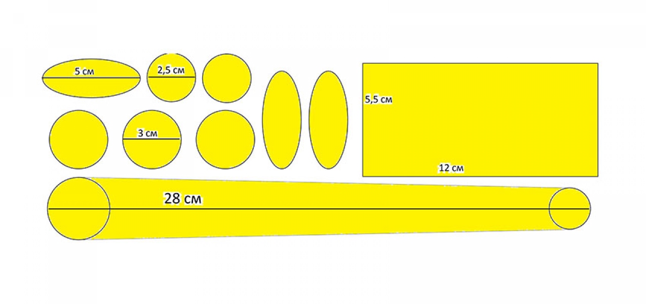 | Размеры | 5,5смх12см, d2,5см, d3см, 28см, овал 5 см длинная сторона |